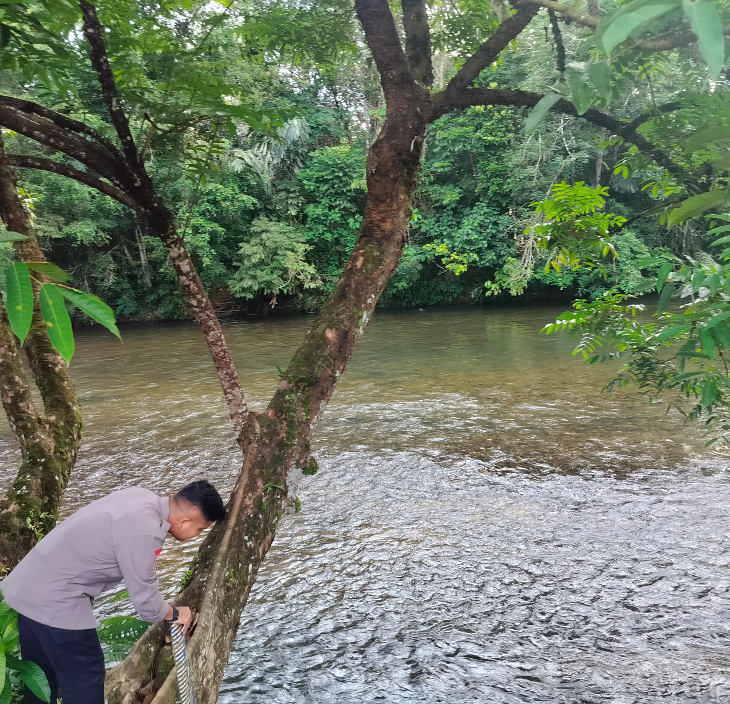 Polres Lamandau – Polsek Delang, Piket Polsek Delang melakukan kegiatan rutin pengecekan debit air DAS Delang di TMA Kelurahan Kudangan RT.02 Kecamatan Delang, Selasa (23/9/25) pagi