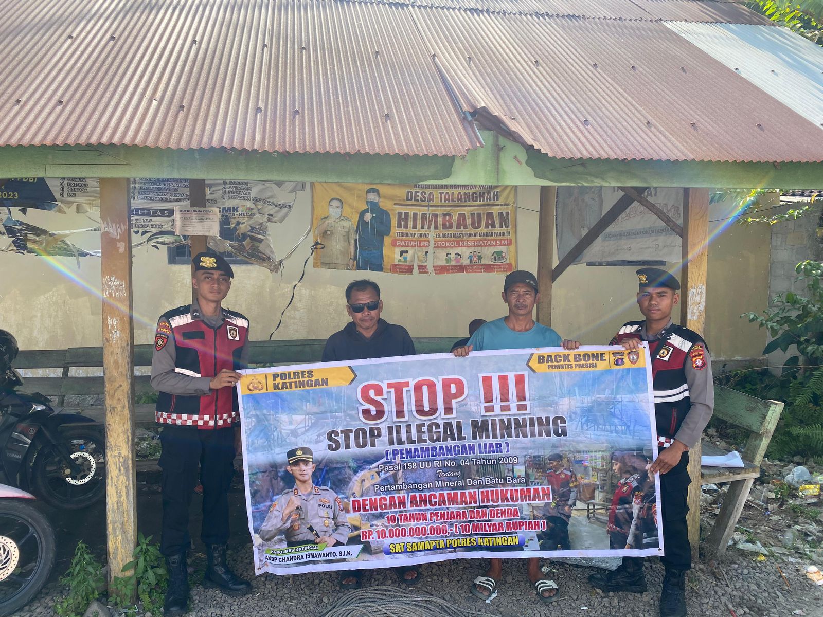 Polsek Tasik Payawan dan Kamipang Polres Katingan melaksanakan sosialisasi menggunakan spanduk yang berbunyi Stop Penambangan Liar Dan Penggunaan Bahan Kimia Merkuri / Sianida di desa binaannya, Jumat (14/11/2025) pukul 08.22 WIB.